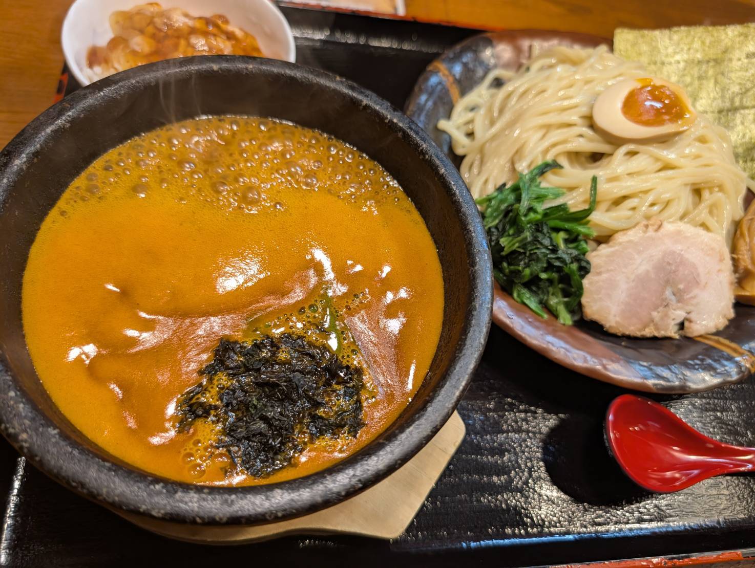 さらに、あつあつで濃厚な海老の旨みがギュッと凝縮された、「真心堂」さんの海老つけ麺も外せません。